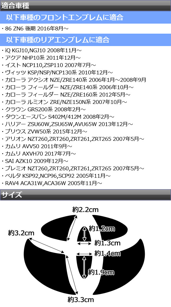 エンブレムカバー エンブレムシール エンブレムデカール フロントエンブレム バックドアエンブレム リアエンブレム エンブレム マーク 紋章 カバー フロント リア リヤ バック オーナメント ■適合車種 トヨタ TOYOTA 86 iQ アイキュー アクア イスト ヴィッツ カローラ アクシオ フィールダー ルミオン クラウン タウンエースバン タウンエース バン ハリアー プリウス アリオン カムリ SAI サイ プレミオ ベルタ RAV4 ラヴフォー ラブフォー マット 無地 艶無し ツヤ無し つや無し 艶消し ツヤ消し つや消し