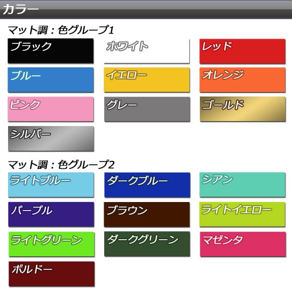 色グループ2 パープル ブラウン ボルドー マゼンタ ダークグリーン ダークブルー ライトイエロー ライトグリーン ライトブルー シアン 紫 PURPLE 茶 BROWN MAGENTA 緑 DARK GREEN 青 BLUE 黄 LIGHT YELLOW CYAN ブルーグリーン