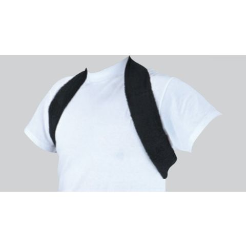 ・首に掛けて脇の下から背中へまわしてワンタッチバックルで装着します。