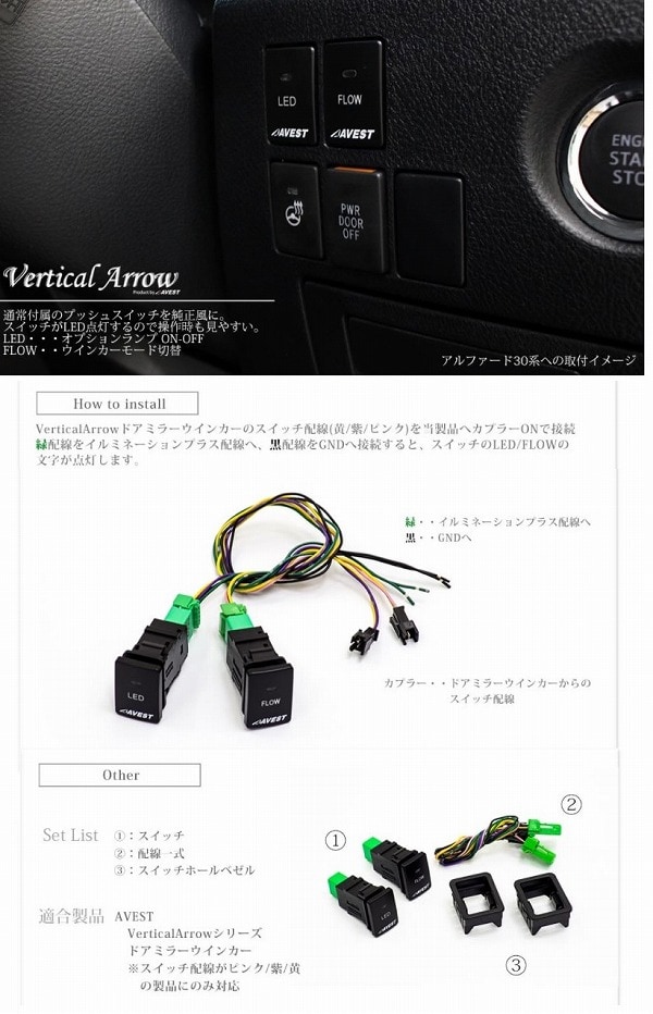 スイッチ配線<ピンク/紫/黄>を当製品へカプラーONで接続してください。緑配線をイルミネーションプラス配線へ、黒配線をGNDへ接続すると、スイッチのLED/FLOWの文字が点灯します。