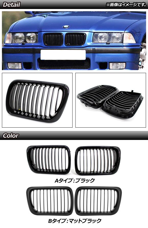 フロントグリルカバー BMW 3シリーズ E36 1997年~1999年 マットブラック Bタイプ ABS製 シングルバー 入数:1セット(2個) AP-FG306-B