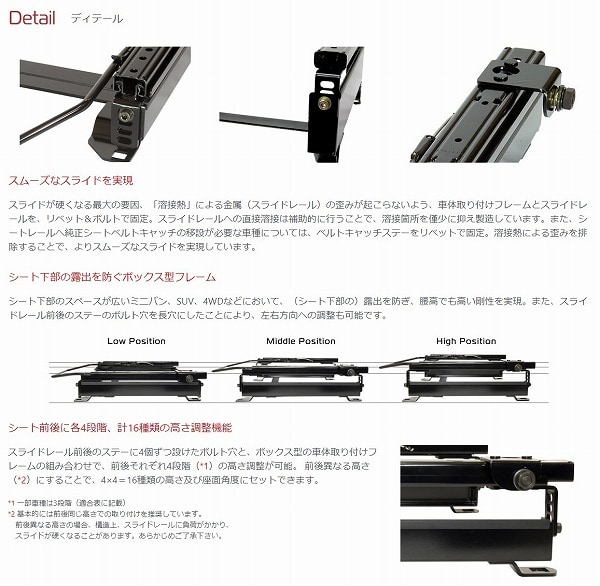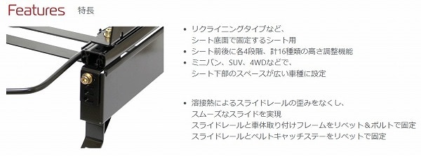 シート下部のスペースが広いミニバン、SUV、4WDなどにおいて、(シート下部の)露出を防ぎ、腰高でも高い剛性を実現。また、スライドレール前後のステーのボルト穴を長穴にしたことにより、左右方向への調整も可能です。