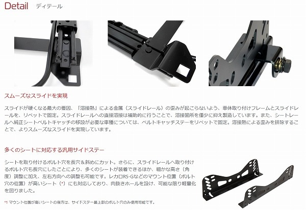スライドが硬くなる最大の要因、「溶接熱」による金属(スライドレール)の歪みが起こらないよう、車体取り付けフレームとスライドレールを、リベットで固定。スライドレールへの直接溶接は補助的に行うことで、溶接箇所を僅少に抑え製造しています。また、シートレールへ純正シートベルトキャッチの移設が必要な車種については、ベルトキャッチステーをリベットで固定。溶接熱による歪みを排除することで、よりスムーズなスライドを実現しています。