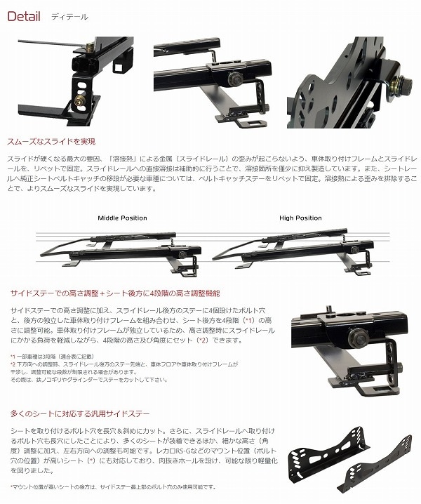 ※下方向への調整時、スライドレール後方のステー先端と、車体フロアや車体取り付けフレームが干渉し、調整可能な段数が制限される場合があります。その際は、鉄ノコギリやグラインダーでステーをカットして下さい。