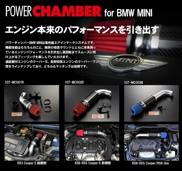 パワーチャンバーBMW MINIは高性能エアインテークシステムです。機能性能はもちろんのこと、独特の吸気サウンドとともに本来持っているエンジンパフォーマンスを引き出し、高回転までスムーズに吹き上がるフィーリングを楽しんでいただけます。