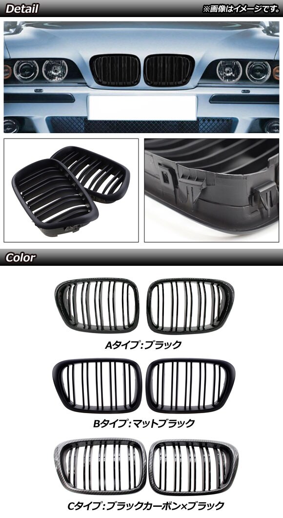 フロントグリルカバー BMW 5シリーズ E39 4ドア車用 1996年~2004年 マットブラック Bタイプ ABS製 ダブルバー AP-FG327-B 入数:1セット(2個)