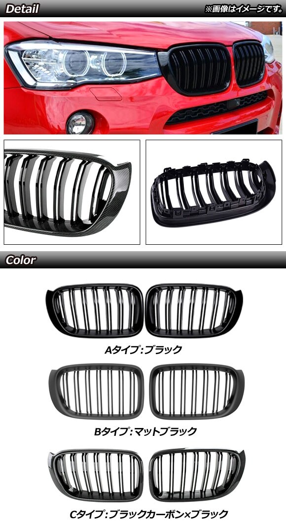 フロントグリルカバー BMW X3/X4 F25/F26 後期 2014年~2017年 ブラック Aタイプ ABS製 ダブルバー 入数:1セット(2個) AP-FG346-A