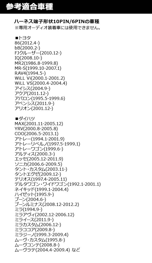 ■適合車種 TOYOTA 86 bB クルーザー IQ MR2 MR-S RAV4 アイシス アクア アベンシス アリオン DAIHATSU MAX YAV COO アトレー アルティス エッセ ソニカ タント タントカスタム テリオス デルタ ネイキッド ハイゼット ブーン ミラ ミライース ムーブ ムーブカスタム ムーヴ ムーヴカスタム ミラジーノ オーディオ カーオーディオ ハーネス カーナビ ナビ ステレオ カプラー カプラ プラグ コネクター コネクタ ケーブル コード 接続 配線