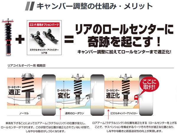 「MIRACLE CAMBER ADJUSTER」・「MIRACLE STROKE ADJUSTER」は、BLITZサスペンションキット「DAMPER ZZ-R」を対象に設計・製造されています。