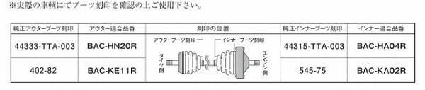 ※リビルト品及び、新車時とは異なるドライブシャフトで修理交換されている車輌の場合は適合が異なる場合がありますので、ご注意下さい。