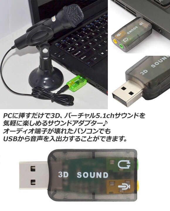 USB サウンド アダプター アダプタ サラウンド サウンドカード カード サウンドユニット オーディオ USBポート 変換 接続 ジャック 端子 プラグ 音楽 ミュージック DVD ブルーレイ ゲーム 映画 ホームシアター 臨場感 音 音源 音質 改善 マイク スピーカー ヘッドホン ヘッドフォン イヤホン イヤフォン アンプ パソコン PC デスクトップ ラップトップ ノートパソコン ノートPC 周辺機器 アクセサリ インターフェース 5.1ch 5.1 チャンネル 3D バーチャル 疑似 仮想 USBバスパワー USBバス 外付け 外部 ステレオ モノラル コンパクト ミニ