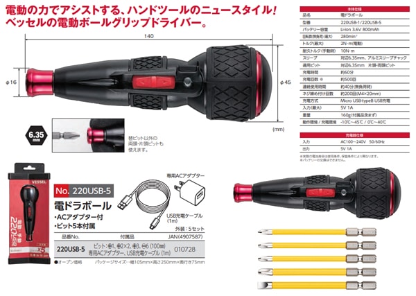 ベッセル/VESSEL 電ドラボール ビット5本付き 220USB-5