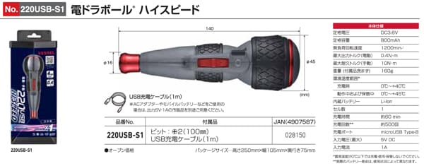ベッセル/VESSEL 電ドラボール ハイスピード ビット1本付き 220USB-S1
