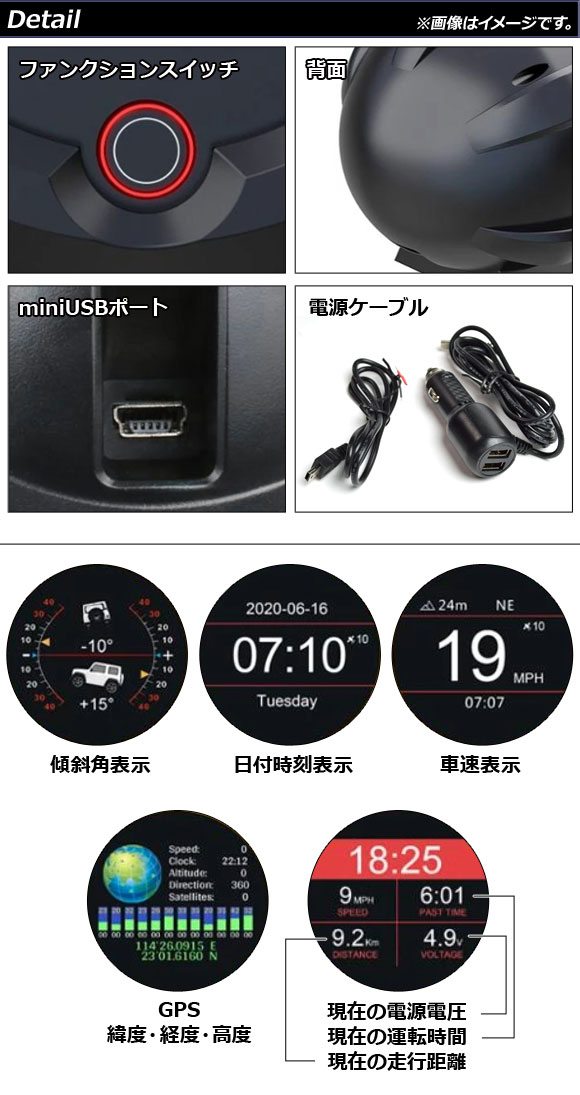 スロープメーター クリノメーター スピードメーター メーター GPS 時計 速度計 計測器 時間 時刻 日付 高度 標高 緯度 経度 傾度 スロープ 衛星 衛星測位 座標 ピッチ角 前後 ロール角 左右 水平 傾斜角 角度 上り坂 下り坂 傾斜 斜面 斜め 坂道 坂 コンパス 速度 車速 スピード 速さ 警告 測定 機能 電源 スイッチ ボタン バッテリー 電圧 オフロード 走行 運転 ダッシュボード コンソール 車載 車内 取り付け 増設 設置 便利 HUD ヘッドアップディスプレイ ヘッドアップディスプレー ディスプレイ ディスプレー 画面 内装 インテリア