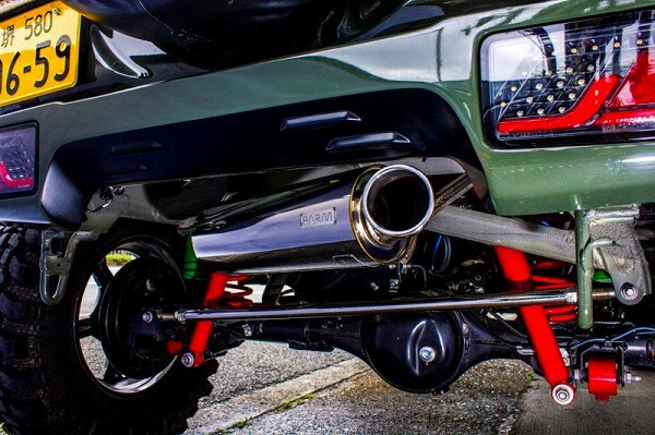 ショートバンパーに合わせ、マフラーエンドをフレームギリギリまで上げ全長を短くする事で、オフロード走行時に岩や障害物等がマフラー本体に干渉し難いように設計しております。
