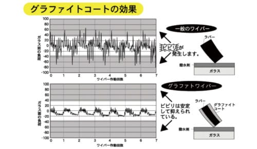 ミューテクノワイパーはその現象を低減させるグラファイト(カーボンの粉)をラバー部にコーティングし、摩擦抵抗を低減させ優れた払拭性能を発揮します。
