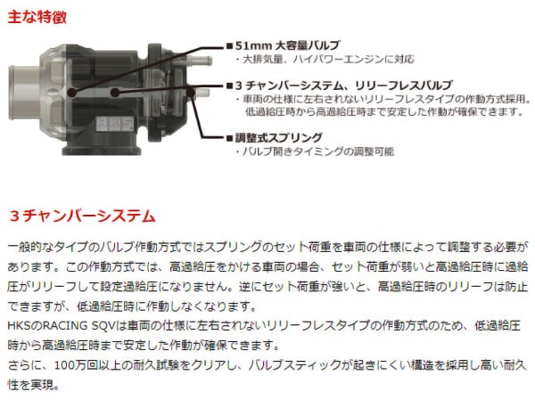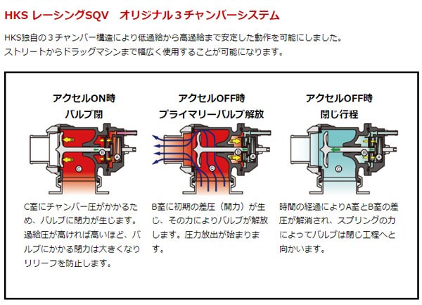 HKSオリジナルの3チャンバーシステムにより、リリーフレス構造で高過給時でも安定した作動を実現。