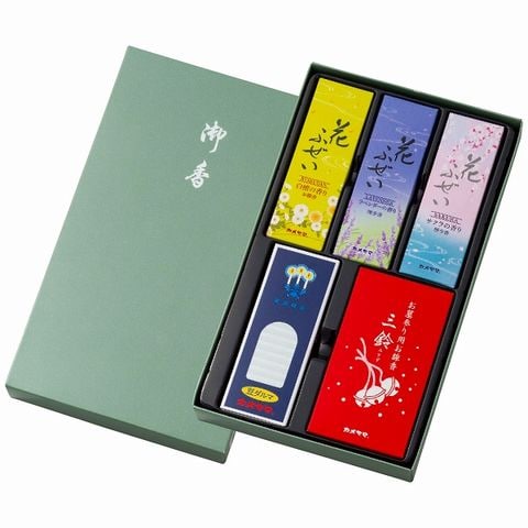 使う方の使い勝手を最優先に考えたお線香と蝋燭の詰合せギフトです。花ふぜいシリーズ(白檀・ラベンダー・桜)の香り3種と三鈴香、カメヤマローソク豆ダルマの詰合せ。