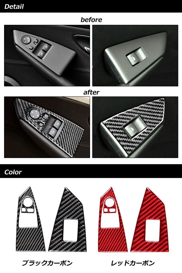 パワーウインドウスイッチステッカー BMW 6シリーズ E63/E64 2003年10月~2011年01月 ブラックカーボン カーボンファイバー製 右ハンドル用 入数:1セット(3個) AP-IT2570-BKC
