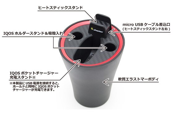IQOSポケットチャージャーとIQOSホルダーとヒートスティックが同時にホールドできるオールインワン仕様で、一般的なドリンクホルダーに収納可です。電源(microUSB)を本製品に接続すると、ホールドしながら充電も可能(充電専用回路を内蔵)。電源(microUSB)を接続すると内部のブルーLEDが点灯し、夜間でも使いやすいです。吸殻は約40本収納可能です。