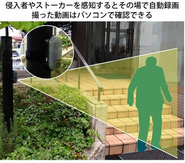 侵入者やストーカーを感知するとその場でmicroSDカードに自動録画します。