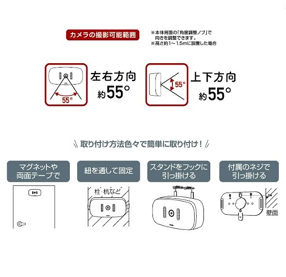 ・【レンズ視野角】水平約55°/垂直約55°角度調整可能)※高さ1.5m設置時