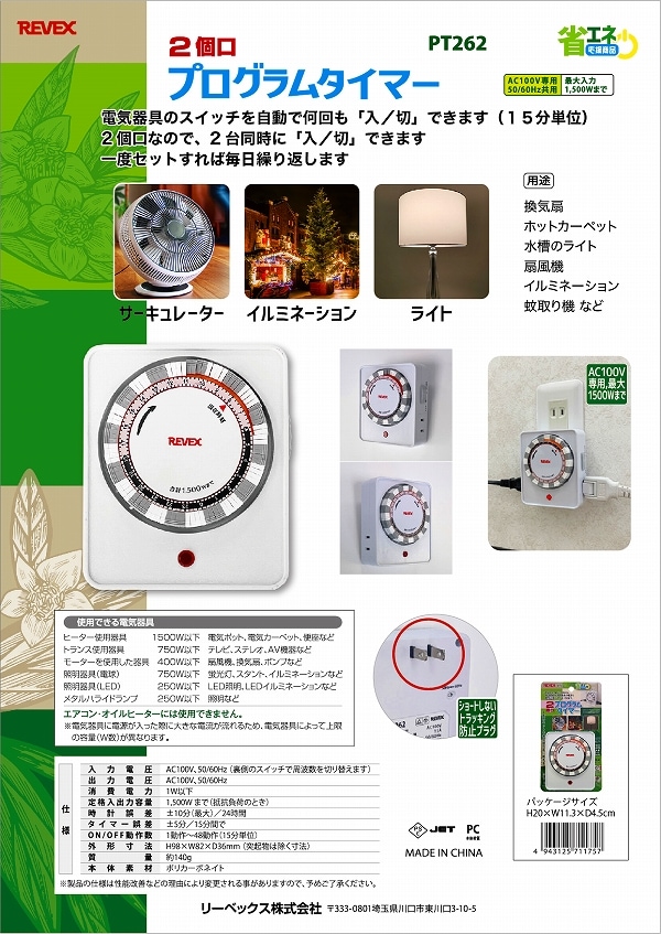 リーベックス/REVEX プログラムタイマー2個口 PT262