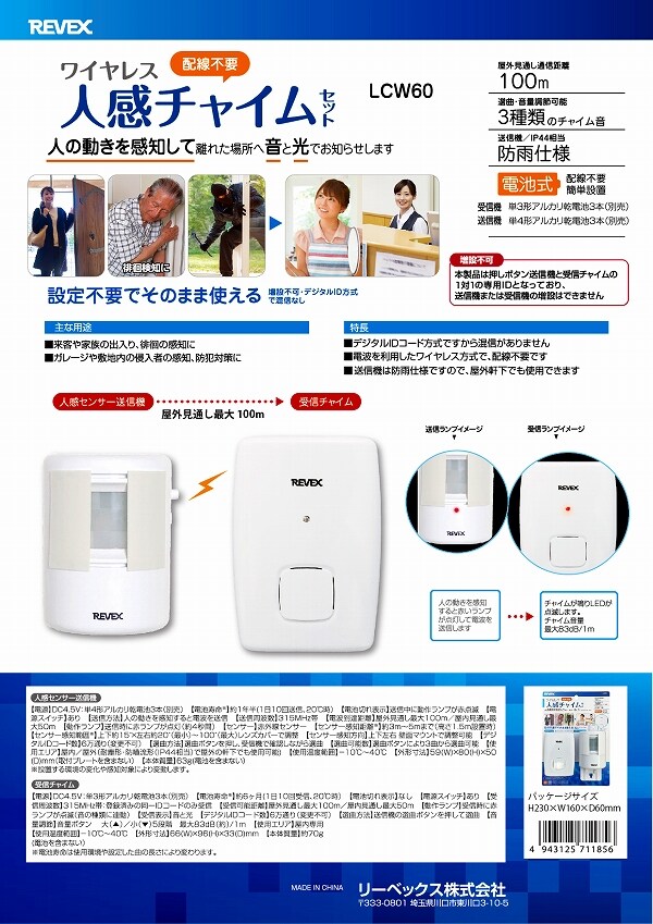 リーベックス/REVEX ワイヤレス人感チャイムセット LCW60