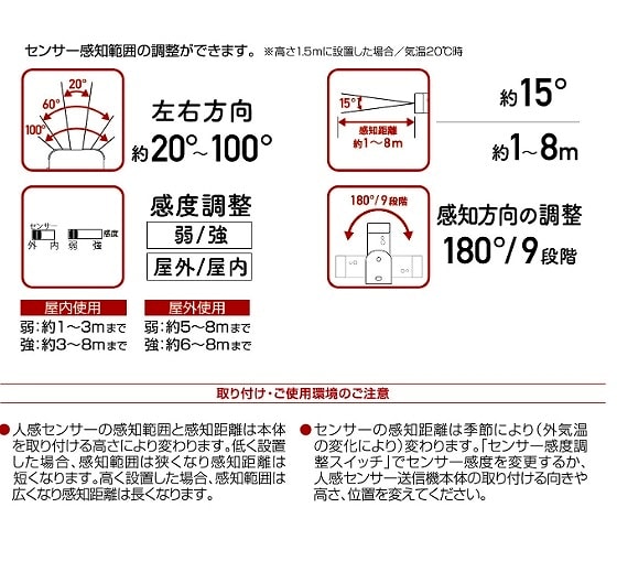 人や動物の動きを感知し、離れた場所にある受信機が光やチャイム音でお知らせします。