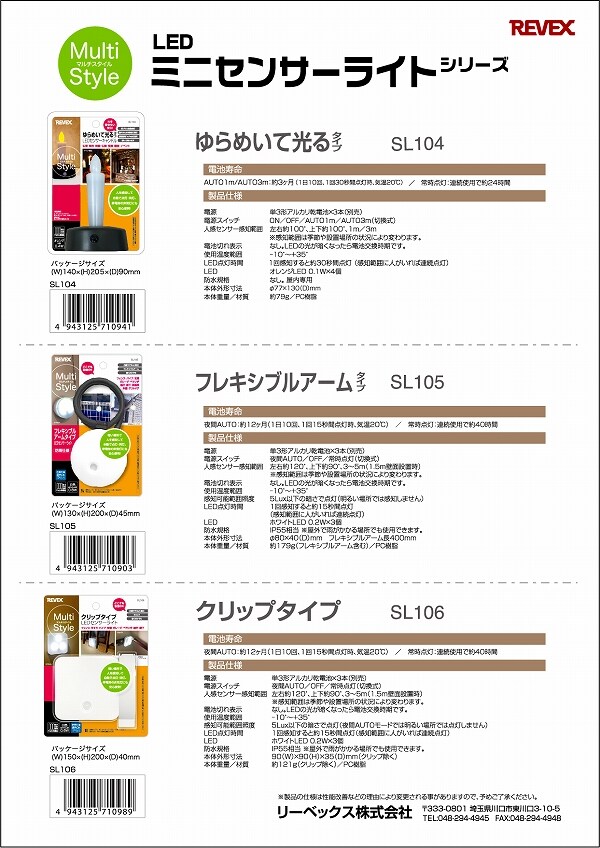 ・点灯時間:1回感知すると約15秒点灯(SL104は約30秒)。