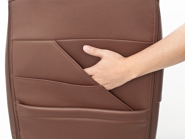 「純正のインテリアイメージを崩さずに、自分らしさを愛車に加えたい!」そんなイメージにぴったりのデザインシートカバーです。センター部分にはパンチングレザーを使用することで通気性の良い快適な座り心地を実現。またスマートフォンなどをすぐに出し入れできるサイドのスマホポケットや、シート背面に配した大型ポケットは収納物を座ったままでも容易に出し入れできるようなデザインを採用し見た目のデザインと機能性を兼ねそろえた実用的なシートカバーになっております。シンプルなデザインでありながら太めのサイドデザインラインにインテリアのワンポイントとなる別色生地を使用することで個性表現。