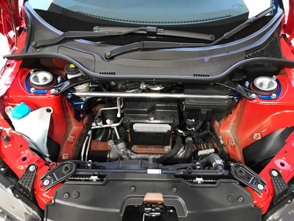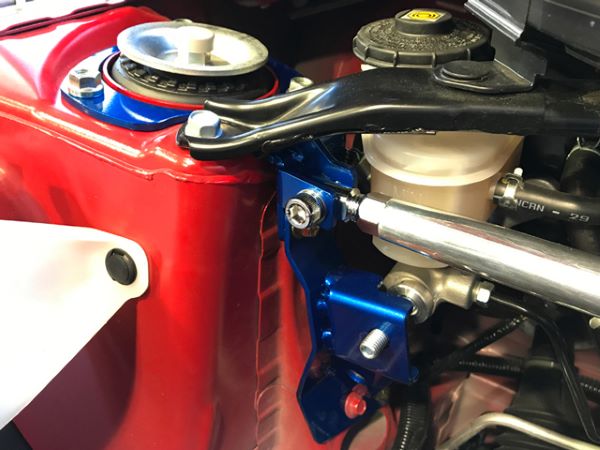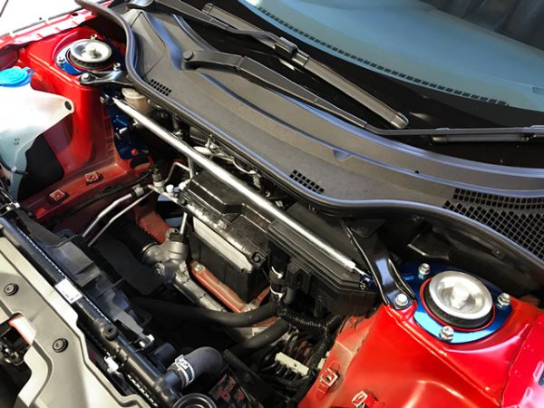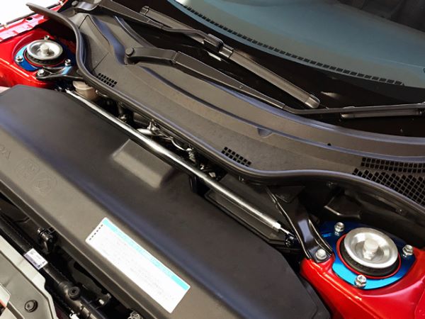 そこでマスターシリンダーを逆側(ボンネット側)からガッチリと固定してバルクヘッドのしなりを最小限に抑え、しっかりとダイレクトに感じるブレーキタッチを実現させます。ボディ側を上下4点止めとした事でより一層の剛性感を体感頂けると思います。タワーバーはユーティリティーボックスの開閉が容易に出来るように設計。コーナリング時とブレーキング時の剛性を同時に向上させる画期的な剛性パーツとなります。
