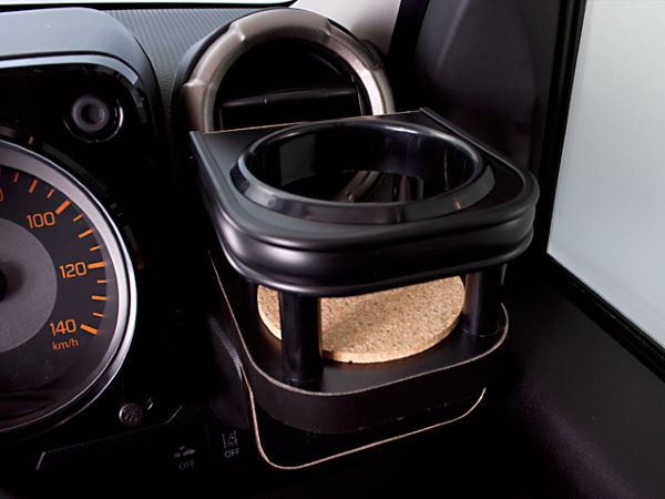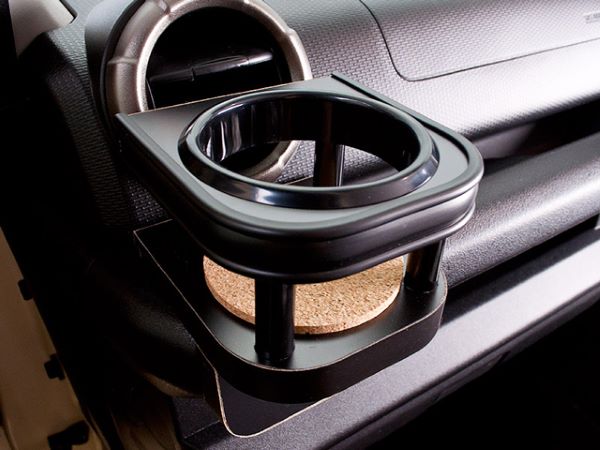 乗り始めて思う「純正ドリンクホルダー」の使いにくさ。純正ドリンクホルダーにドリンクを置いて運転するのは少し危険です。そこで!使いやすさを重視した専用タイプのドリンクホルダーを開発。エアコンからの冷風/温風でドリンクの保冷もOK!カラーを室内色に合わせブラックに統一し、後付感を軽減。純正のボルト穴を使用し付属の専用ボルトで固定するため、加工も一切必要ありません。