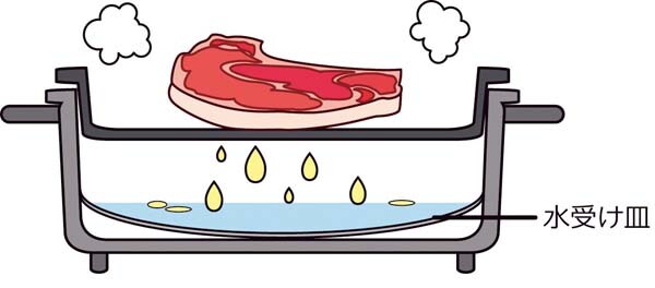 脂がプレ-トの穴から水受け皿に落ちるので煙が出にくくなっています。煙が出るのは加熱され食材から出た油が燃えるからです。水受け皿に水を入れておけば落ちた油は水に冷やされて燃えないので煙が出にくくなる、という仕組みになっています。