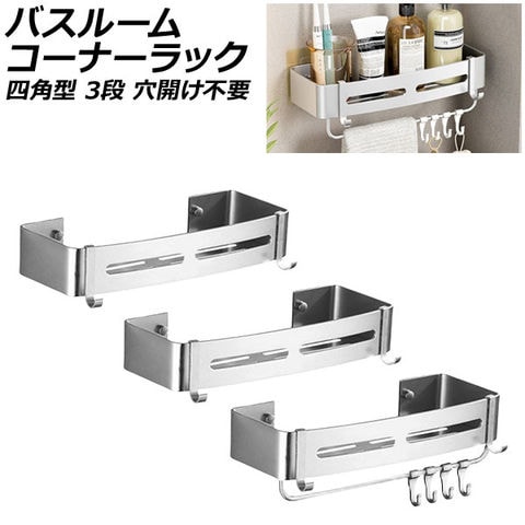 バスルームコーナーラック 3段 シルバー アルミ合金製 四角型 粘着シートでしっかり固定!穴開け不要!水はけ&風通しも抜群 AP-UJ0884-C-SI