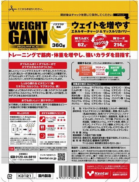 健康体力研究所 ケンタイ けんたい けんこうたいりょくけんきゅうじょ WEIGHT GAIN ADVANCE BANANA LATTE 粉末 タンパク質 バナナラテ味 360グラム 0.36kg プロテイン サプリメント 運動 トレーニング 健康 体 身体