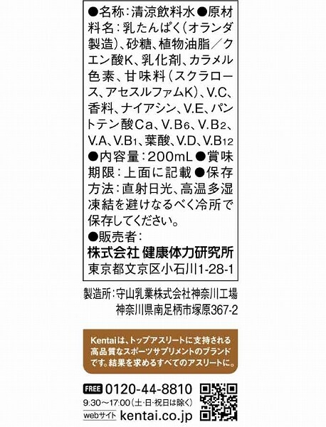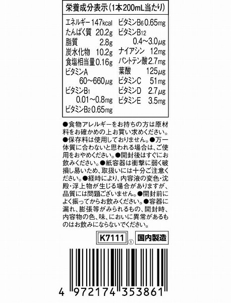 乳たんぱく(オランダ製造)、砂糖、植物油脂 / クエン酸K、乳化剤、カラメル色素、甘味料(スクラロース、アセスルファムK)、V.C、香料、ナイアシン、V.E、パントテン酸Ca、V.B6、V.B2、V.A、V.B1、葉酸、V.D、V.B12