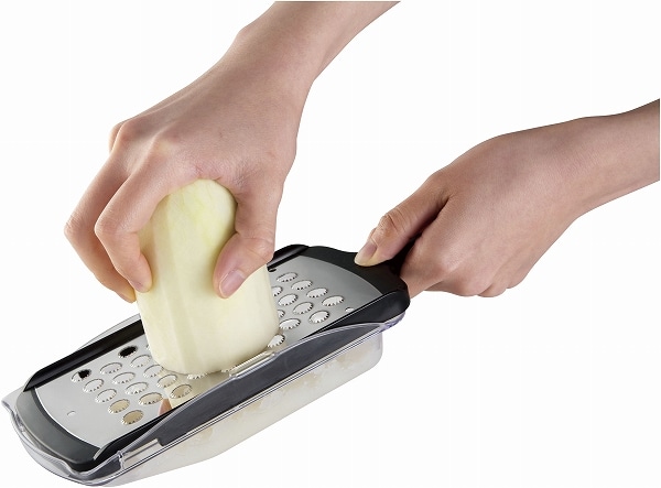容器付きで受け皿なしで使え、おろした食材はこぼさず水切りできます