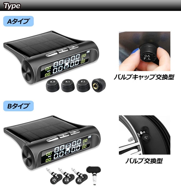 タイヤ空気圧モニター Bタイプ バルブ交換型 ソーラー/USB充電 汎用 AP-EC802-B