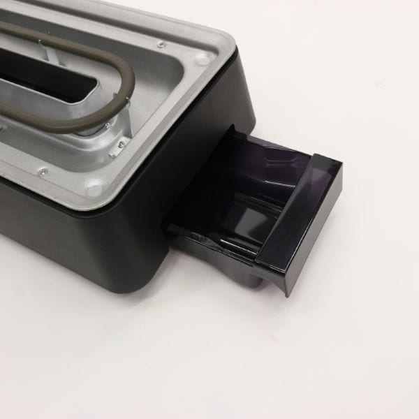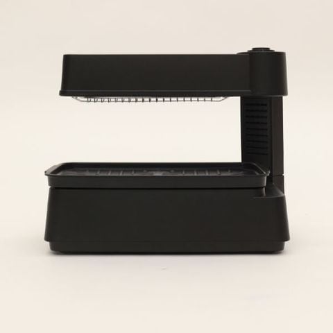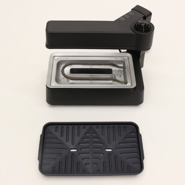 ヒーターが上にあるので、食材が熱源に触れず、プレートの傾斜が食材の油分をトレイに落とすので、油分も熱せられず、無煙調理が可能!