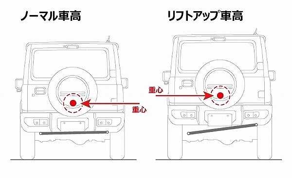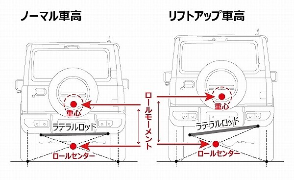 リフトアップにより重心位置が高くなると、ロールセンター(※1)と距離が離れます。この、重心とロールセンターの距離が「ロールモーメント(=ロール量)」です。ロールモーメントが大きければ大きいほど、車体は左右に大きくロールするようになります。