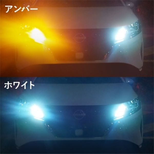 通常、走行時には消灯しているウインカーバルブをポジションランプとしてホワイト色に点灯させた状態で走行することができます。ウインカー使用時には、方向指示を出した側がアンバー色の点滅に切り替わり、反対側はポジションランプとしてホワイト色の点灯を続けます。
