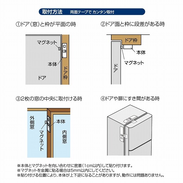 マグネットセンサーが、ドアや窓の閉め忘れを感知して30秒後に音声やアラームを鳴らします。