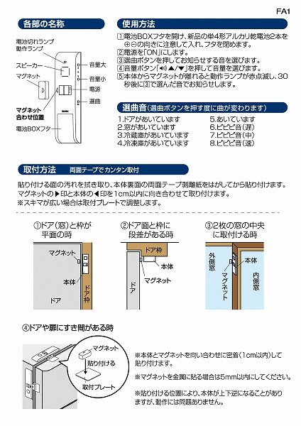 動作:マグネットが本体から離れると動作ランプが点滅し30秒後にお知らせ