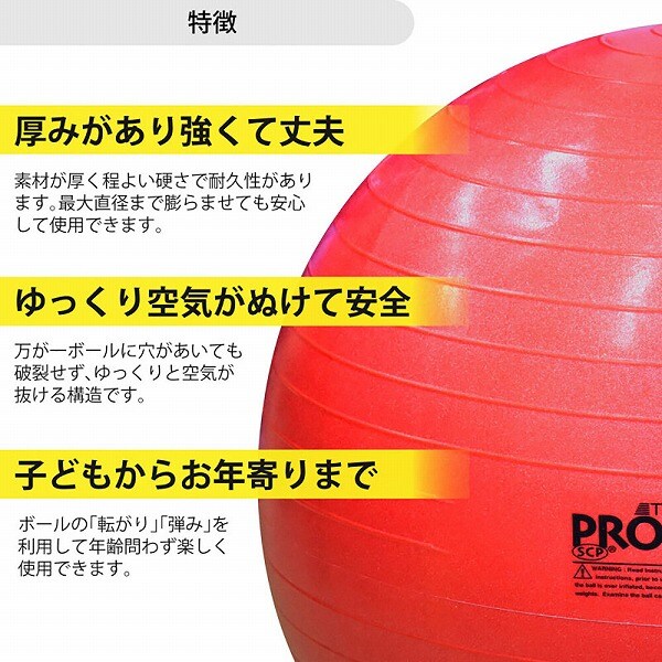 耐久性に優れた素材で、子どもから高齢者まで楽しく使えるエクササイズボールです。