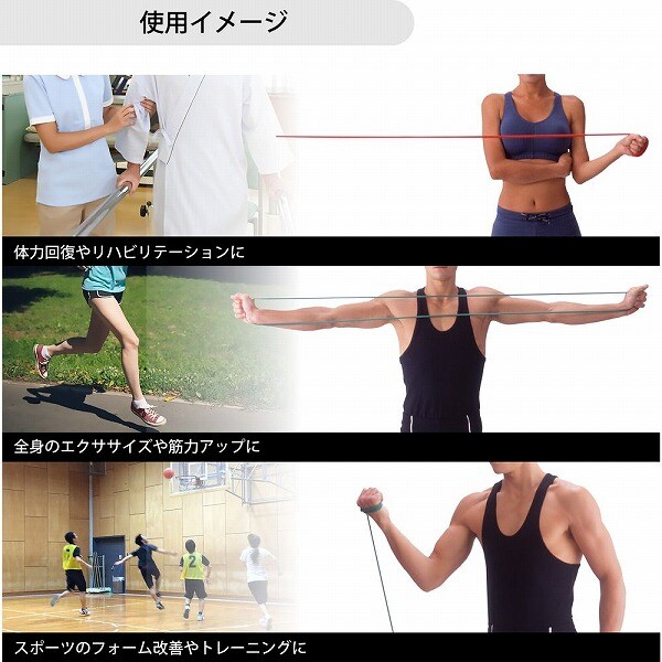 ・結んでループ状にしたり、エクササイズする部位や場所などによって様々な応用使いに対応できます。