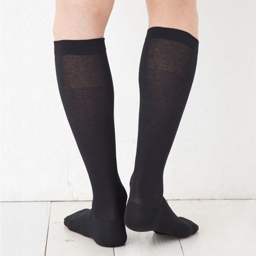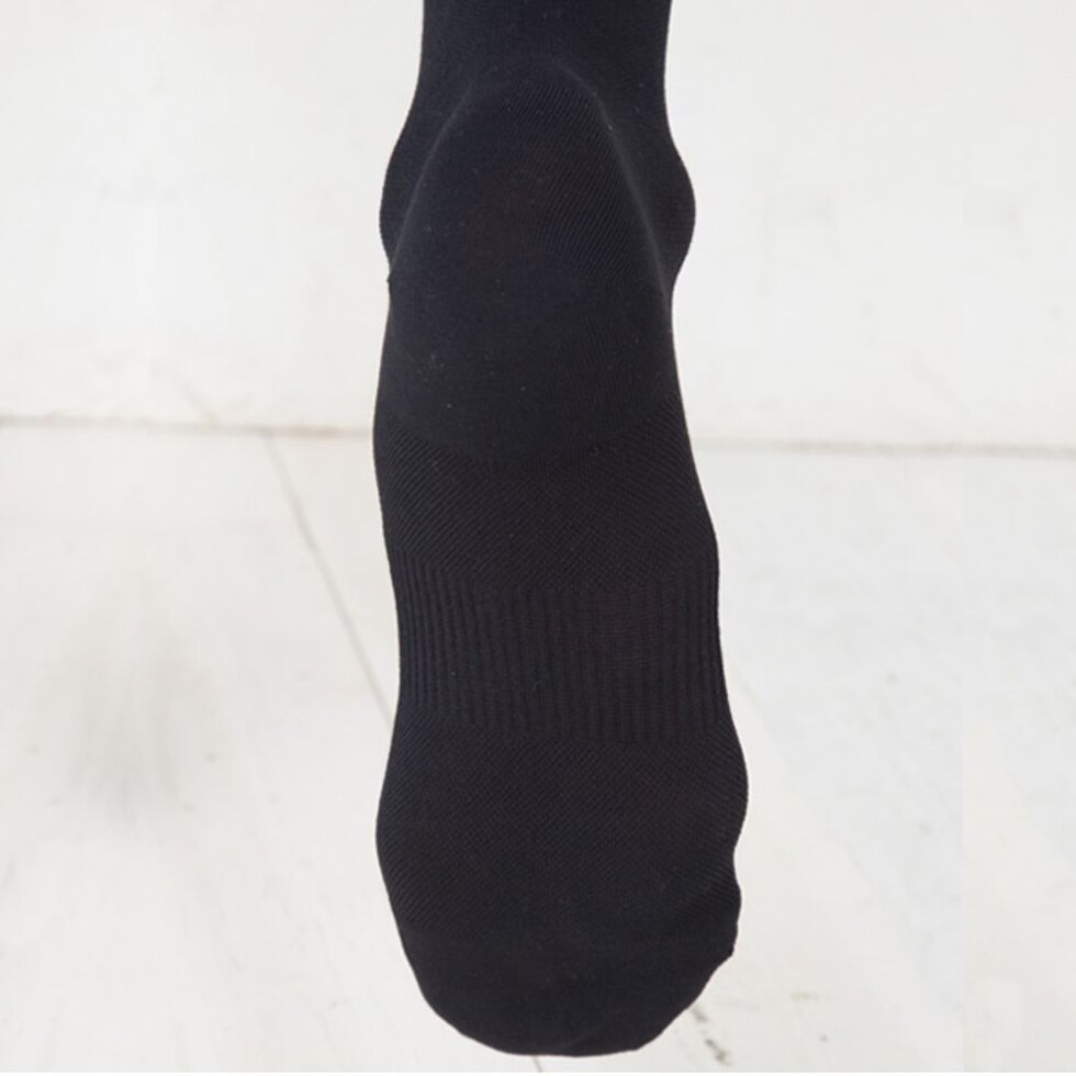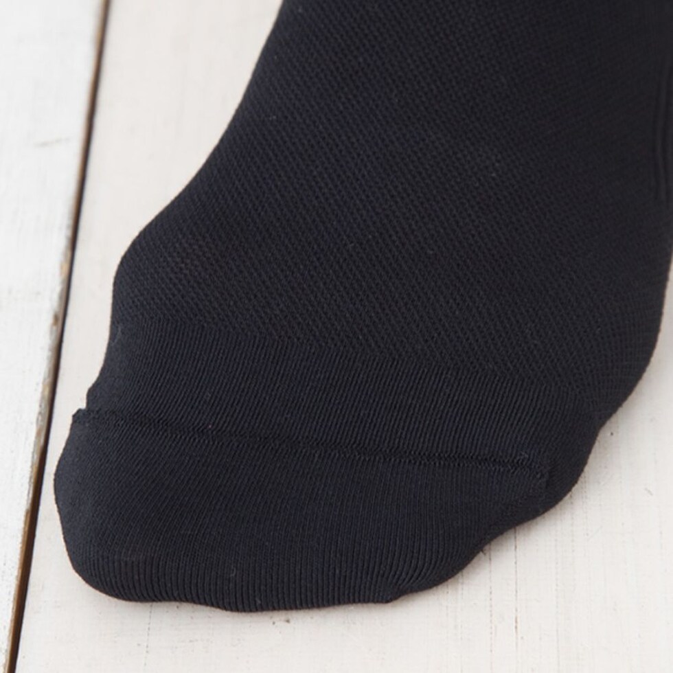 着圧ハイソックス、ポリエステルの特性を活かし、通気性・吸水速乾性を実現させながら綿のようなソフトな風合いをもった特殊繊維を採用しています。