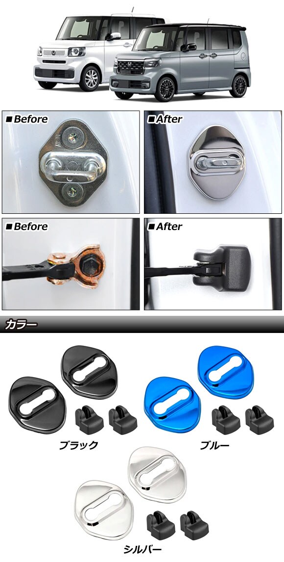 ドアロックストライカー&ストッパーカバー ホンダ N-BOX/N-BOXカスタム JF5/JF6 2023年10月~ ブラック ステンレス/ABS製 入数:1セット(4個) AP-IT3544-BK