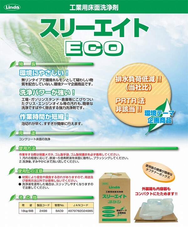 横浜油脂工業(Linda) 工業用床面洗浄剤 スリーエイトECO 18kg 水性 BA09(2498)