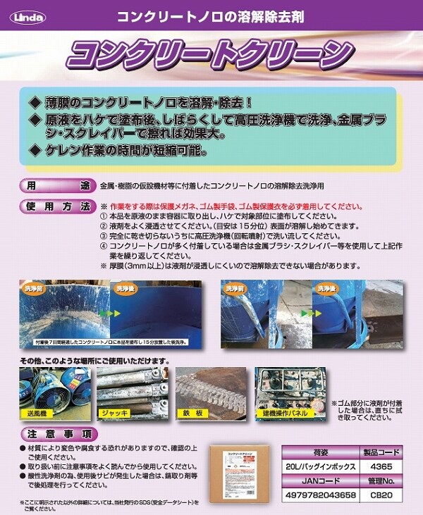 用途:金属・樹脂の仮設機材等に付着したコンクリートノロの溶解除去洗浄用